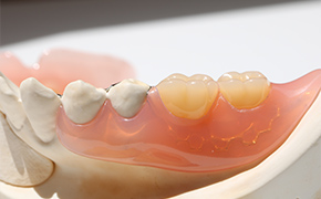 金属のバネを使わず、見た目に配慮した部分入れ歯です。軽くてフィットしやすく、装着時の違和感が少ないのが特徴です。金属の味が気にならず、自然な見た目を重視したいというかたに適しています。ただし、破損した場合は修理が難しく、再製作が必要になることもあります。