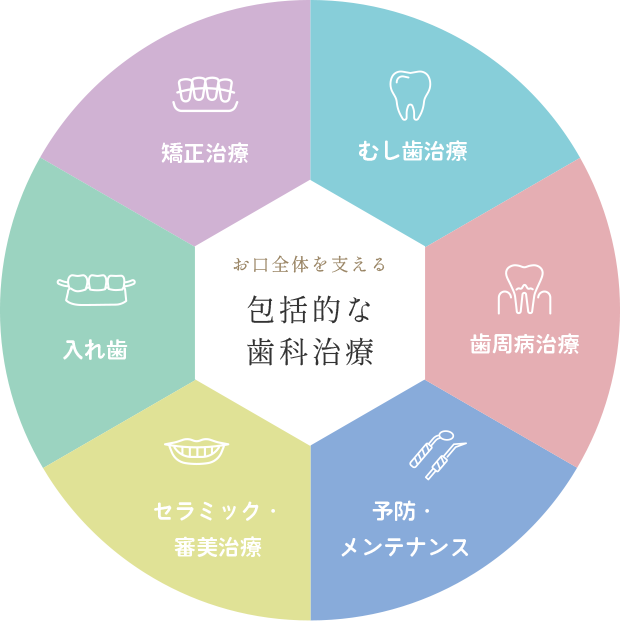 むし歯や歯周病の治療に加え、予防ケアや定期的なメンテナンス、さらには矯正治療や審美面を考慮したセラミック・審美治療まで、幅広い診療を行っています。患者さま一人ひとりの状態や生活習慣をふまえた治療プランを立案し、各分野の専門的な知識と技術を活かしながら包括的にアプローチすることで、長期的なお口の健康維持を目指しています。